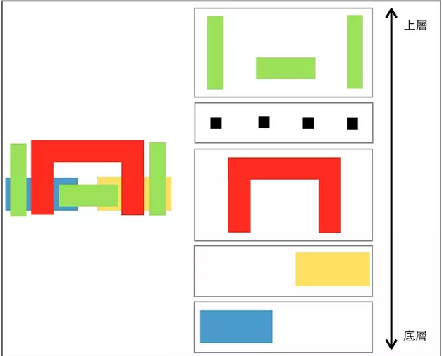 首先,目前已经知道一颗 IC 会产生多张的光罩,这些光罩有上下层的分别,每层有各自的任务。下图为简单的光罩例子,以积体电路中最基本的元件 CMOS 为範例,CMOS 全名为互补式金属氧化物半导体(Complementary metal–oxide–semiconductor),也就是将 NMOS 和 PMOS 两者做结合,形成 CMOS。至于什么是金属氧化物半导体(MOS)?这种在芯片中广泛使用的元件比较难说明,一般读者也较难弄清,在这裡就不多加细究。